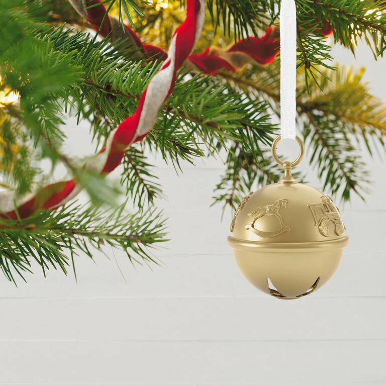 Celebrate 50 years of Hallmark Keepsake Ornaments and add extra jingle to the holiday season with this beautiful complement to your Ring In the Season collection. The matte-gold, premium metal jingle bell Christmas tree ornament features embossed designs representing Keepsake Ornaments through the years, with a heartwarming ring when you jingle it. Coordinating 9th in series sold separately.