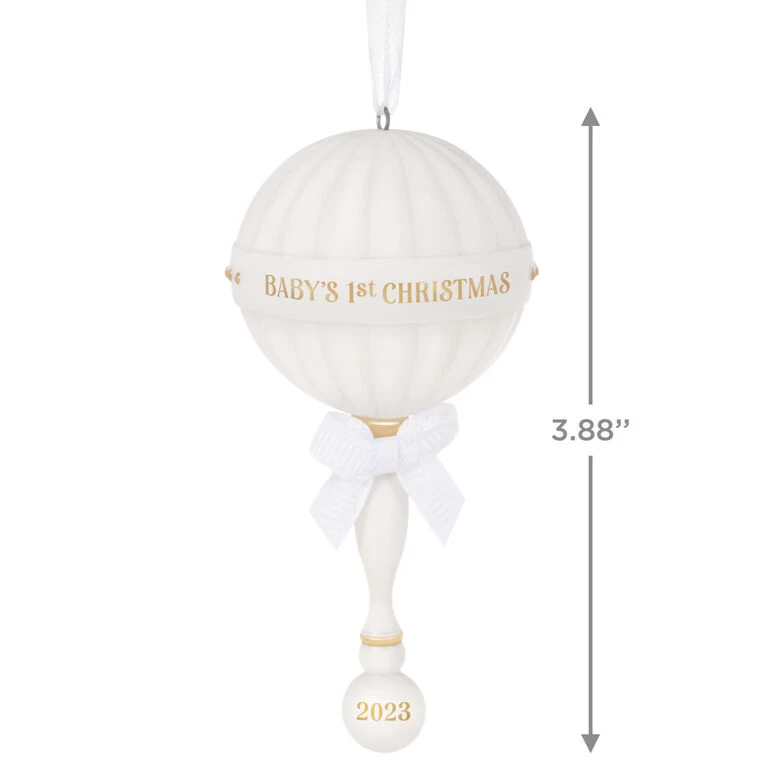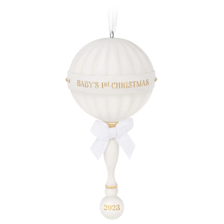 You’ll always remember your baby’s first Christmas. This sweet year-dated Christmas tree ornament features a bisque porcelain baby rattle embellished with metallic gold accents and a ribbon bow attachment to commemorate this special time for your family.