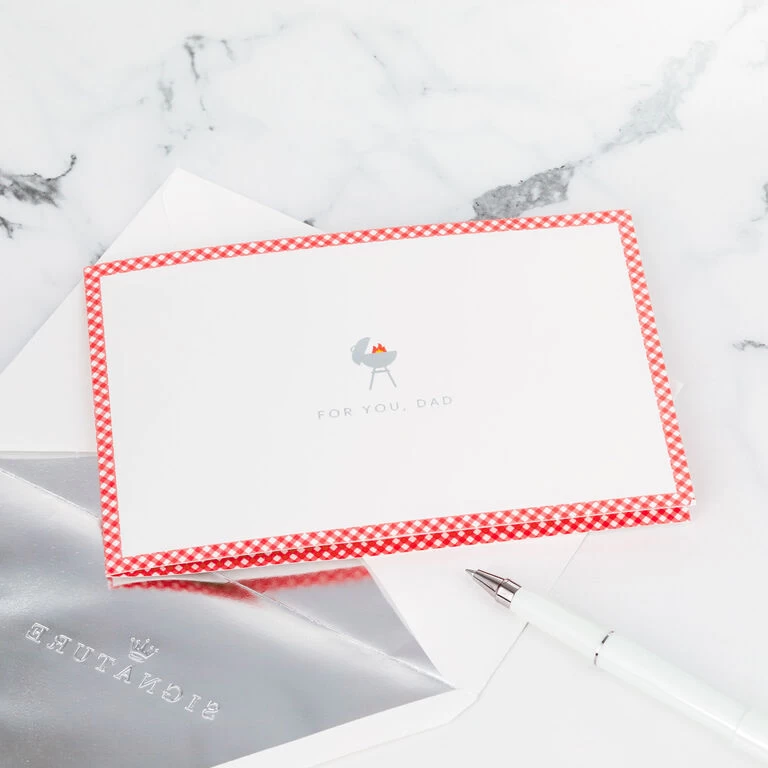 Pop-up Father’s Day greeting card features a grill icon with silver foil accents, red checkered border and a message for your dad. Simply open the card to reveal the 3D pop-up surprise inside—no assembly required: an intricate, laser-cut barbeque grill with faux flames, die-cut utensils and a bucket of cold beverages pops out. Shiny silver foil accents add to the fun. This unique card crafted from premium card stock is a work of art sure to be displayed all year long, making it an unforgettable way to celebrate dad’s day. When open, this pop-up card lays flat for display; 3D pop-up inside measures approx. 5.5″ H.