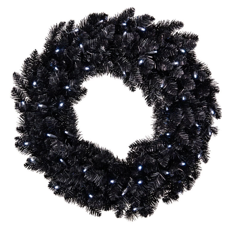 Display a galaxy of ornaments with this black pre-lit wreath. Bright white LED lights are perfect for highlighting your collection of sci-fi or Halloween Keepsake Ornaments. Simply plug into a standard 120-volt wall outlet to see the continuous light effect. For indoor use only.