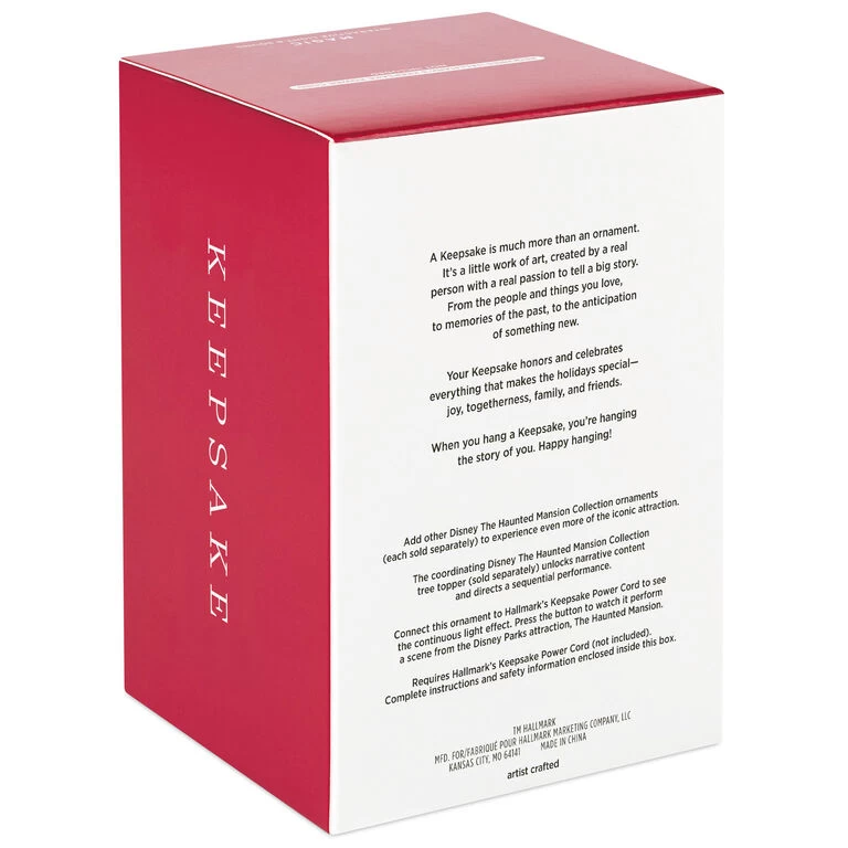 - Key Features: Connect the Interactive Light and Sound ornament to Hallmark’s Keepsake Power Cord (sold separately) to see the continuous light effect. Press the button to watch it perform a scene from the Disney Parks attraction, The Haunted Mansion. Add other Disney The Haunted Mansion Collection ornaments to experience even more of the iconic attraction. The coordinating Disney The Haunted Mansion Collection tree topper unlocks narrative content and directs a sequential performance.