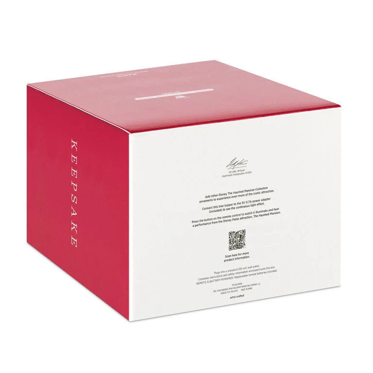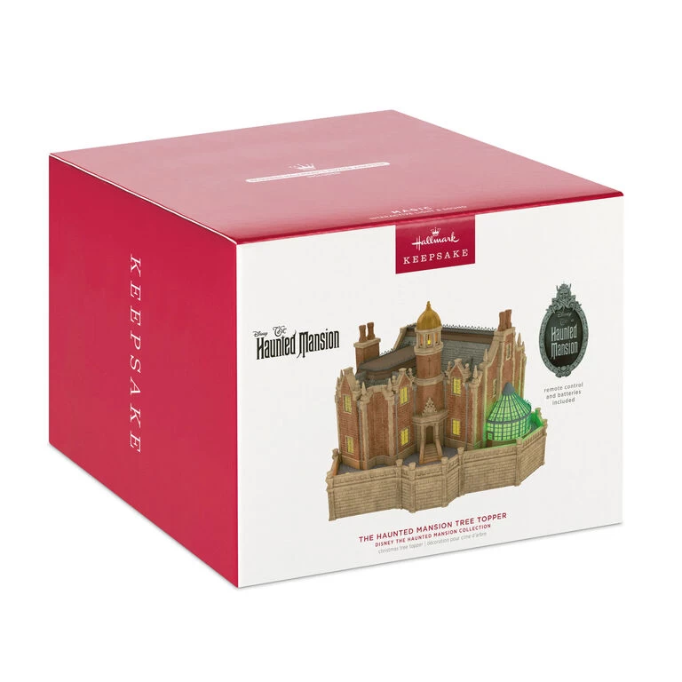 Relive the fun of a visit to the Disney Parks right on your Christmas tree with The Haunted Mansion tree topper that features music and dialogue from the beloved attraction. Plug it into the included power adapter for constant illumination, then press the button on the included remote control to start a synchronized sound and light show. Connect one or more of The Haunted Mansion Collection ornamentsāMadame Leota, Victor Geist, and The Coffin in the Conservatory (each sold separately)āto unlock additional performances that you can’t access with the ornaments alone! We think you’ll agree these happy haunts deserve a place in the dead center of your holiday decor.