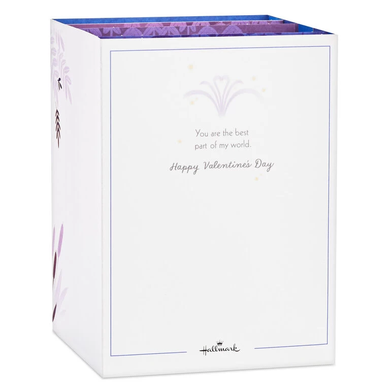 Pop-up Valentine’s Day greeting card features a three-dimensional, die-cut diorama scene from “The Little Mermaid” of Ariel and Prince Eric in a rowboat. Musical card plays the song “Kiss the Girl” performed by Sebastian and lights up when button on front is pressed. Delicate die-cut details adorn the sides to extend the shadow box scene and create a lovely display from any angle. Simply unfold the card to create a peek-through shadow box display—no assembly required. When open for display, 3D pop-up card measures approx. 6.25″ H.