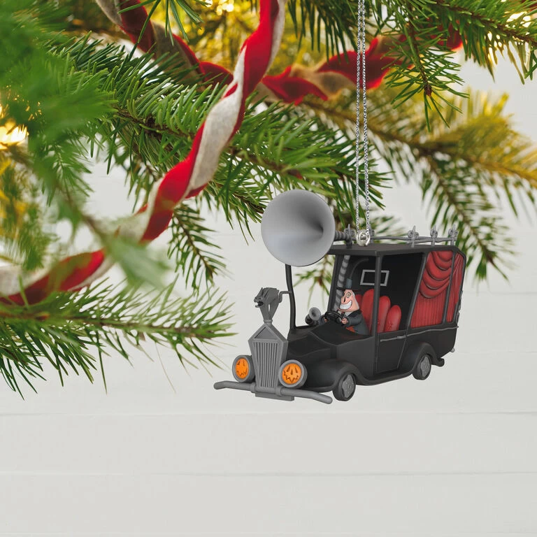 When Jack Skellington is nowhere to be found, the Mayor of Halloween Town has only one optionâto sound the alarms! This fun Christmas tree ornament features audio from the Tim Burton classic “The Nightmare Before Christmas,” including the iconic cat siren that blares from the speaker atop the Mayor’s hearse-like car (battery-operated).