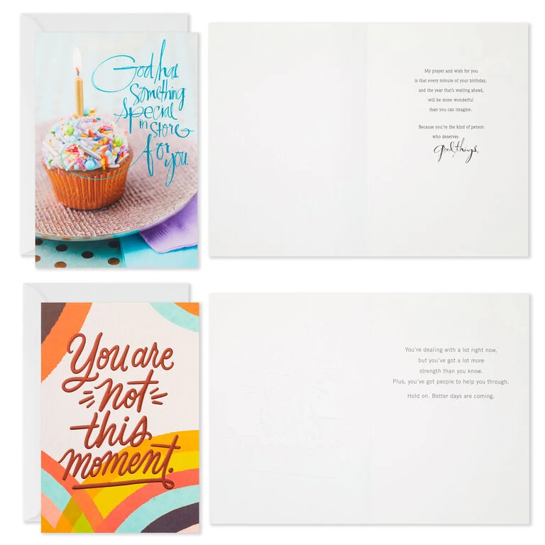 All-occasion greeting cards assortment features 12 unique designs paired with a range of messages that help you share your love for friends and family throughout the year. This multipack of greetings includes designs perfect for birthday, new baby congratulations, friendship, love, sympathy and encouragement.