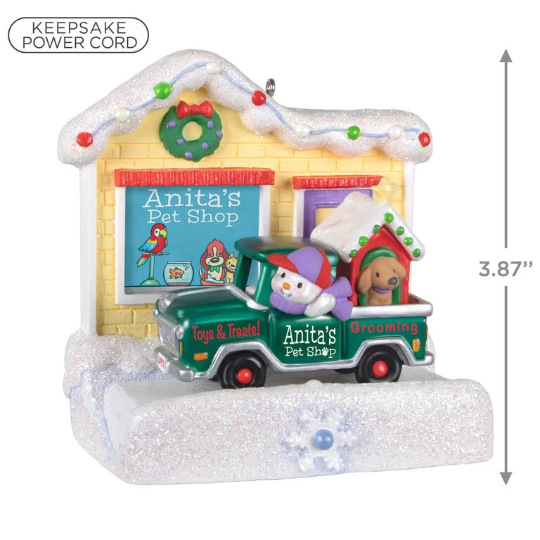 Someone’s getting a new puppy for Christmas! Pet lovers will delight in this Christmas tree ornament featuring a glittery snow scene of a cute pet store and a snowman transporting a pup and doghouse in the shop’s truck. Connect to Hallmark’s Keepsake Power Cord (sold separately) for continuous light, then press the button to hear it play “Deck the Halls.” Connect other Happy Holiday Parade Collection Storyteller ornaments—Joanne’s Christmas Boutique and Gregor’s Trattoria (each sold separately)—to unlock additional amazing interactive performances.