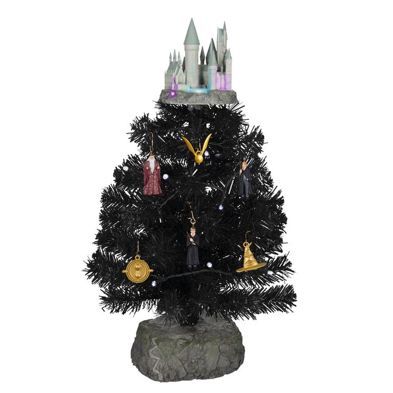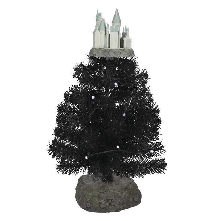 Cast enchanting appeal on your holiday decorating with this stately Wizarding World table decoration set. The tabletop Christmas tree features a sturdy base with a Hogwarts grounds design, school castle tree topper and six miniature ornaments, including Harry Potter, Ron Weasley, Dumbledore, the Golden Snitch, Sorting Hat and Time-Turner. Connect to the included power adapter for continuous light on the castle and prelit tree, then press the button on the base to hear music from “Hedwig’s Theme.”