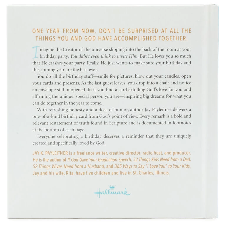 Imagine a birthday card God crafted especially for you! This uplifting book gives an idea just how that birthday card might read. Share a message of love and compassion with this fun hardcover book that will wrap the birthday person in warmth on their birthday and all through the year. Pretty stripe and dot designs set off loving thoughts paired with appropriate Bible scripture verses for a read that will deepen their faith and broaden their joy.