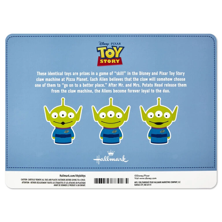 - Set includes three Disney/Pixar Toy Story Aliens miniature itty bittys stuffed animals crafted from soft fabric.