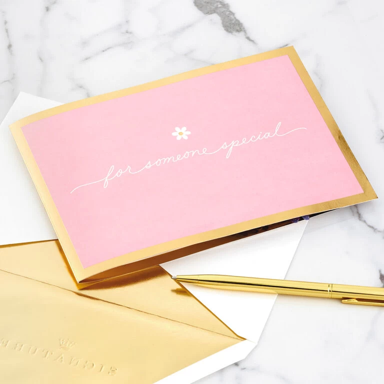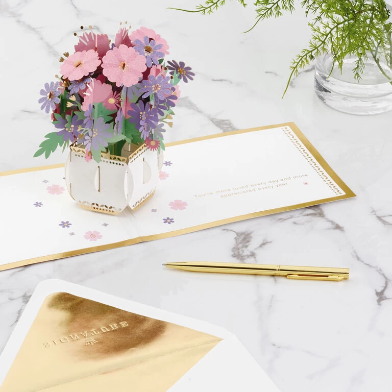 Pop-up love greeting card features a pale pink cover with a “for someone special” message, flower icon and a metallic gold foil border on the front. Simply open the card to reveal the 3D pop-up surprise inside—no assembly required: an intricate, laser-cut bouquet of pink and purple flowers with sparkly glitter accents and shimmering gold foil pops out. This beautiful card crafted from premium card stock is a work of art sure to be displayed all year long, making it an unforgettable way to celebrate Mother’s Day, her birthday or just to let a special friend or family member know how much she’s loved and appreciated—today and always. When open, this pop-up card lays flat for display; 3D pop-up inside measures approx. 5.25″ tall.