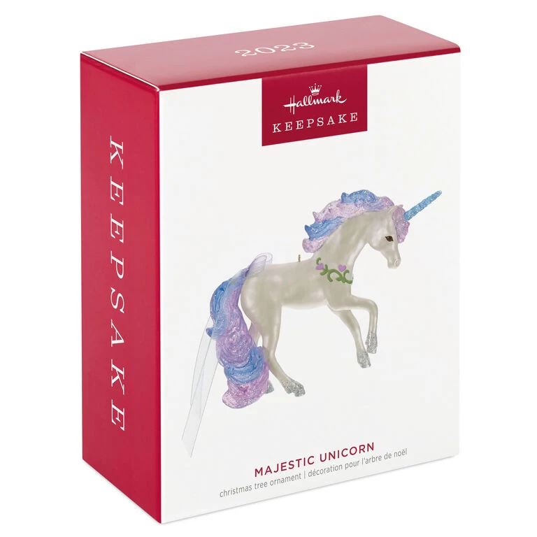 Let this shimmering white unicorn grace your tree with a majestic touch. A pearlized sheen, accented with glittery horn, hooves, mane and tail and a ribbon attachment give this Christmas tree ornament a dazzling grandeur. Makes a sweet gift for a little dreamer.