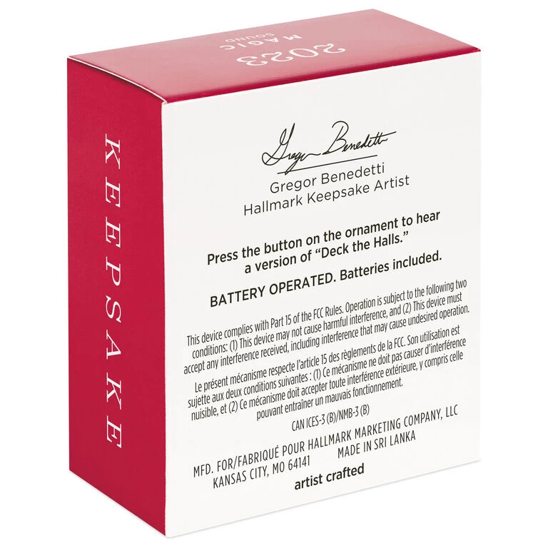- Key Features: Press the button on the Magic Sound ornament to hear a version of “Deck the Halls.” Ornament is miniature size.