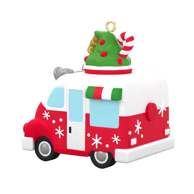 Serve up sweet holiday memories all season long when you display this miniature Christmas tree ornament. The cheery little ice cream truck features a festive soft serve tree on top and plays a fun version of “Deck the Halls” when you push the button (battery-operated).