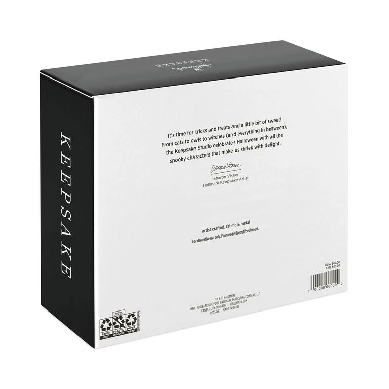 - Additional Details: Artist crafted by Sharon Visker. Plastic Halloween tree topper with metal spring base. Fabric Halloween tree skirt. Spot clean only.