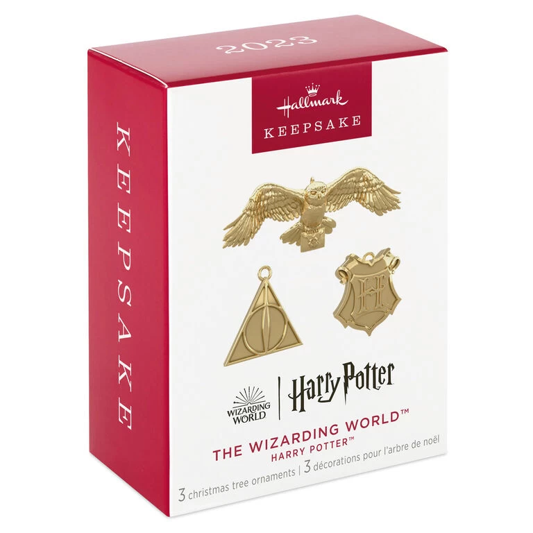 Extend the enchanting appeal of your miniature Wizarding World Christmas tree or any tabletop decoration with these shiny Christmas tree ornaments of noteworthy Harry Potter icons. The set of three mini, metal decorations features the Hogwarts Crest, an owl carrying an official Hogwarts letter and the Deathly Hallows symbol.