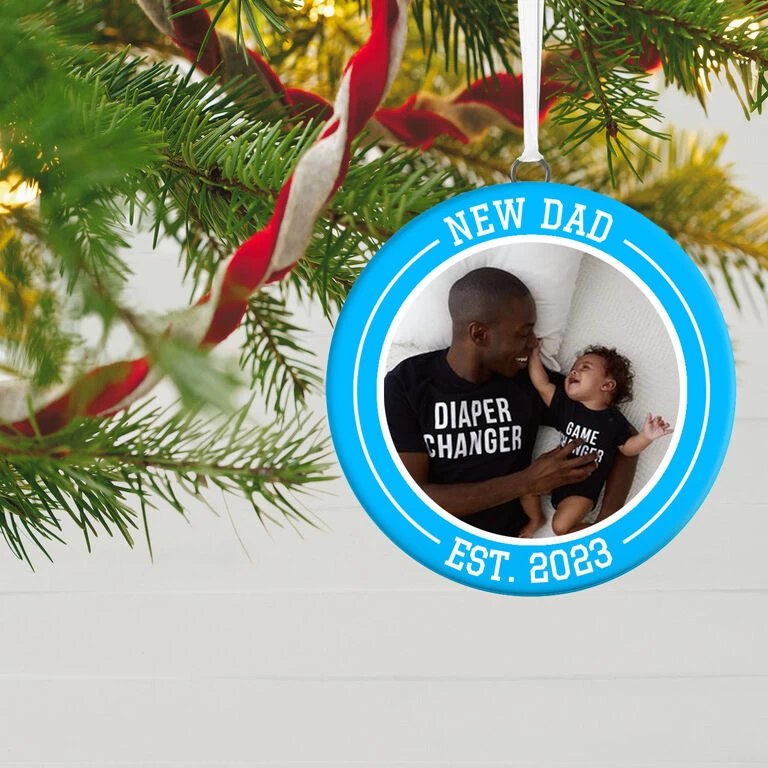 Celebrate the arrival of a little bundle of joy and the special role of new dad with this charming ceramic Christmas tree ornament. Choose from a variety of handsome designs and color palettes to frame a photo of dad and baby, then customize with the year and name, or a personal message. Commemorate this treasured chapter in his life, or give the ornament as a memorable gift to a special new dad you know.