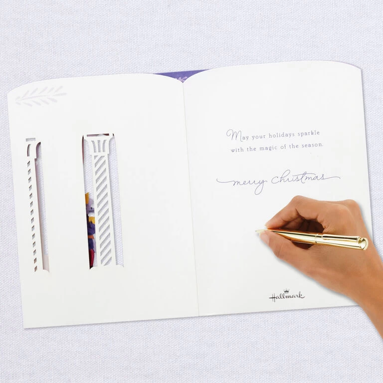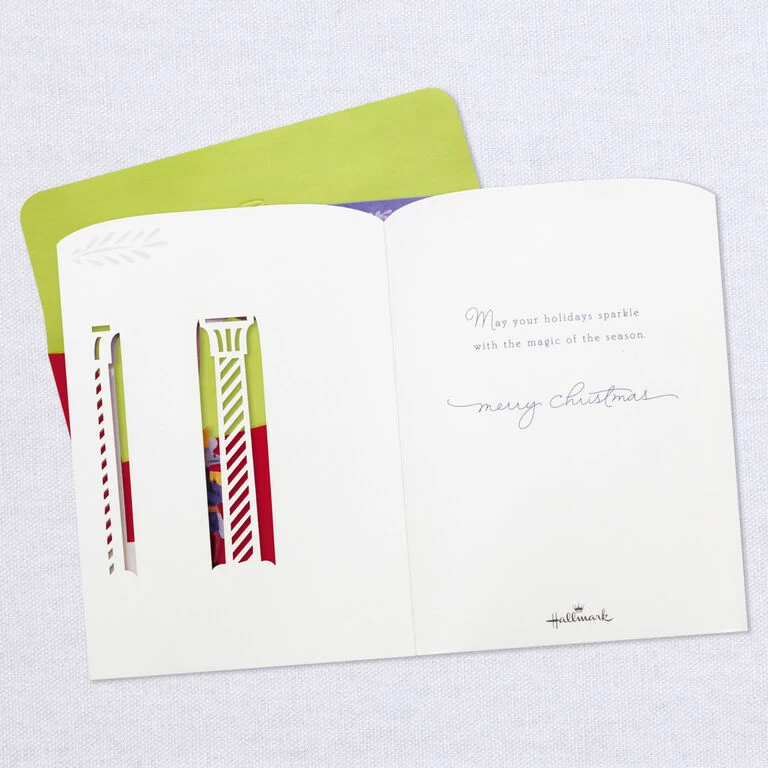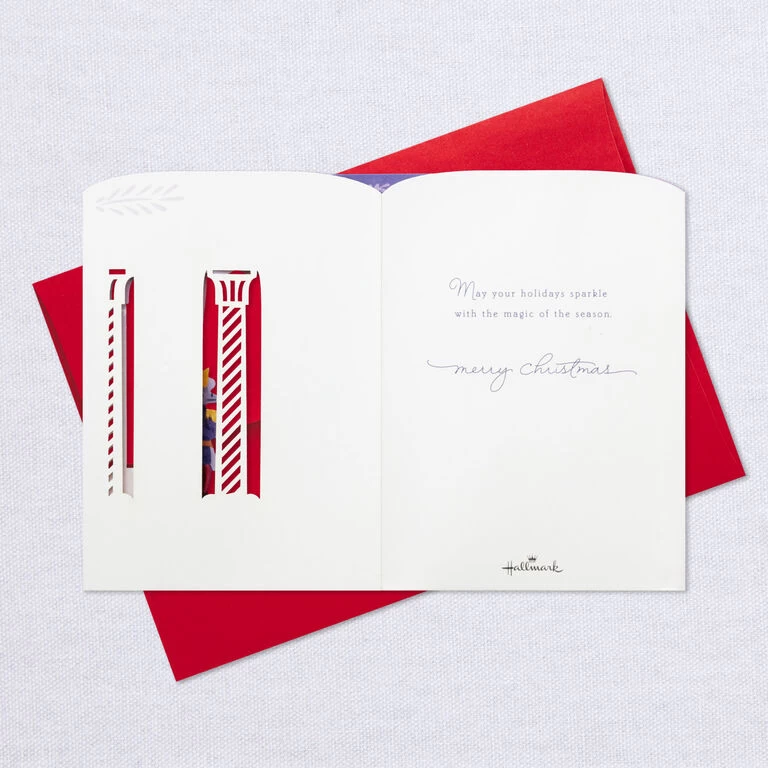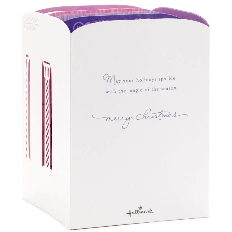 Pop-up Christmas greeting card features a scene from “The Nutcracker” ballet with a light-up backdrop set in a three-dimensional, laser-cut diorama. Musical card plays the song “Dance of the Sugar Plum Fairy” and lights up when button on front is pressed. Delicate die-cut details adorn the sides to extend the shadow box scene and create a lovely display from any angle. Simply unfold the card to create a peek-through shadow box display—no assembly required. When open for display, 3D pop-up card measures approx. 6″ H.