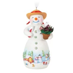 Celebrate your gardening hobby or give this Terran S. Gardner Christmas tree ornament to your favorite green thumb. The porcelain snowman, wearing a gardening hat, holds a flower pot and trowel while a glittery scene of snowmen decorating their landscape with poinsettias adorns the base.