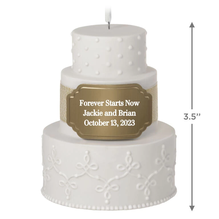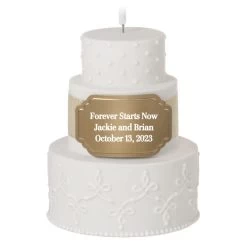 Add a special touch to your first holiday season together with this personalized Christmas tree ornament. The pretty ceramic three-tier wedding cake design features a metal accent to customize with a name, date or personal message. Makes a heartfelt bridal shower or wedding gift for newlyweds.