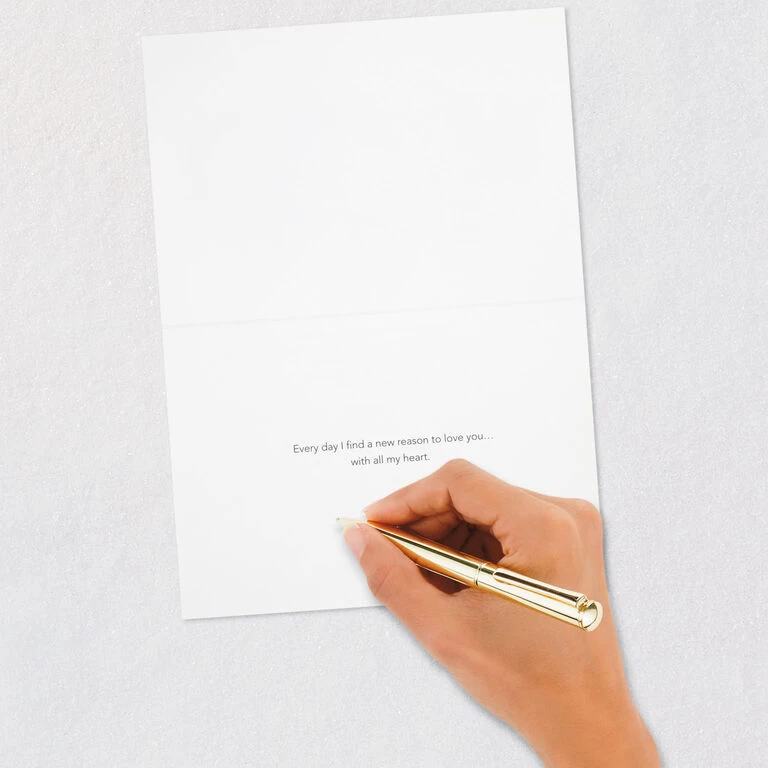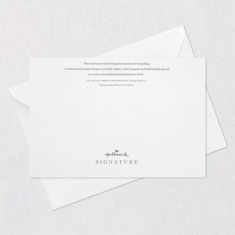 Love greeting card features a handmade “Love” message in red paper-quilled script. Greeting is a work of art that displays beautifully in a 5×7 frame (sold separately), making it an unforgettable way to share a romantic message for their anniversary, birthday and more. Crafted using the ancient art of quilling, in which small strips of paper are hand-rolled, coiled, shaped and individually placed to create a beautiful and detailed piece of art, this Hallmark Signature card was designed in collaboration with Quilling Card LLC, a company seeking to promote the art of paper quilling.